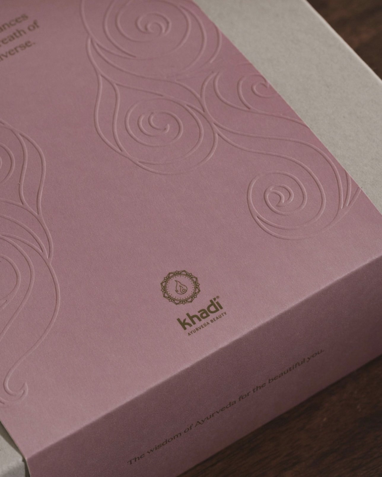 Każdy zestaw khadi jest starannie zapakowany w wysokiej jakości pudełko prezentowe z tektury introligatorskiej i ozdobiony artystycznym tłoczeniem autorstwa mediolańskiego artysty Nikity Fabbro. Każdy zestaw to rytuał. Każdy rytuał to prezent.