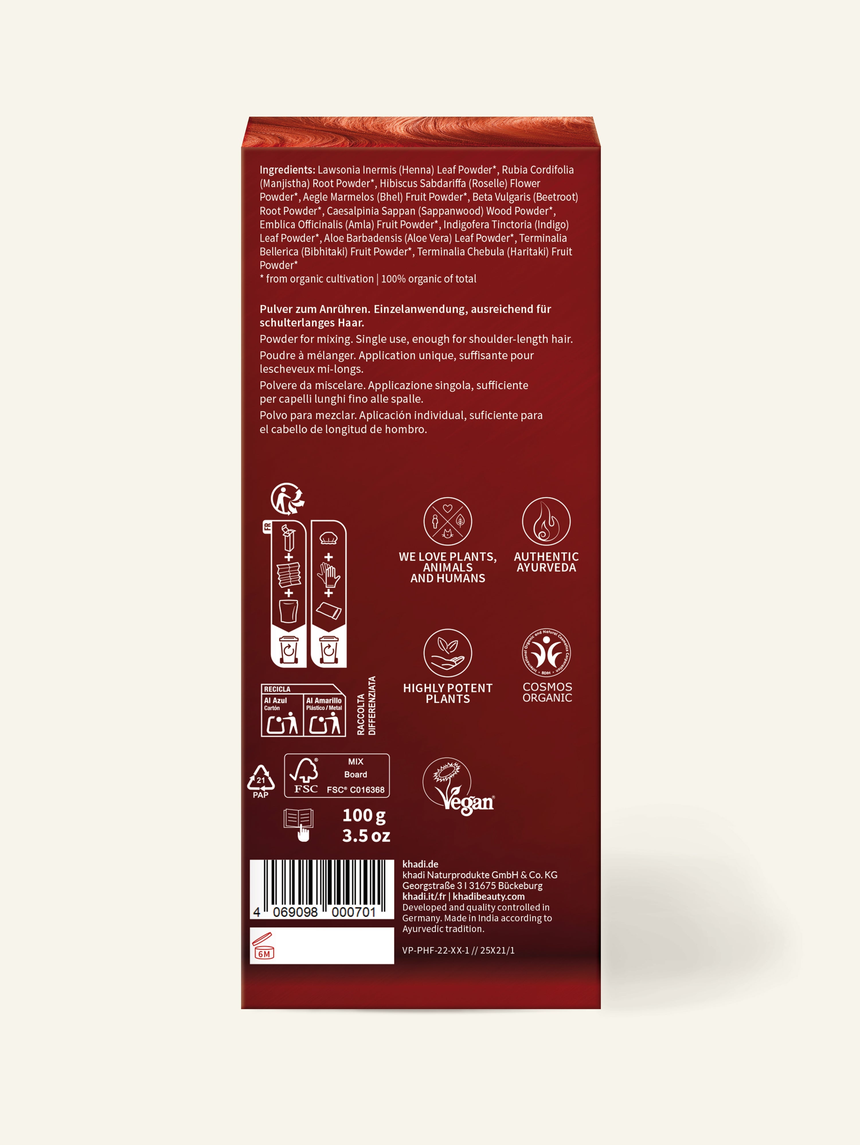 W przeciwieństwie do syntetycznych farb do włosów, w których środki utleniające powodują pęcznienie włosów, aby otworzyć zewnętrzną warstwę łuski dla pigmentów, w naturalnych farbach do włosów khadi pigmenty otulają każdy pojedynczy włos niczym ochronna warstwa. Dzięki ajurwedyjskiej mocy naszych składników włosy i skóra głowy są intensywnie odżywiane podczas koloryzacji i zyskują nową witalność. Rezultat: zdrowe włosy, intensywny kolor i promienna uroda.