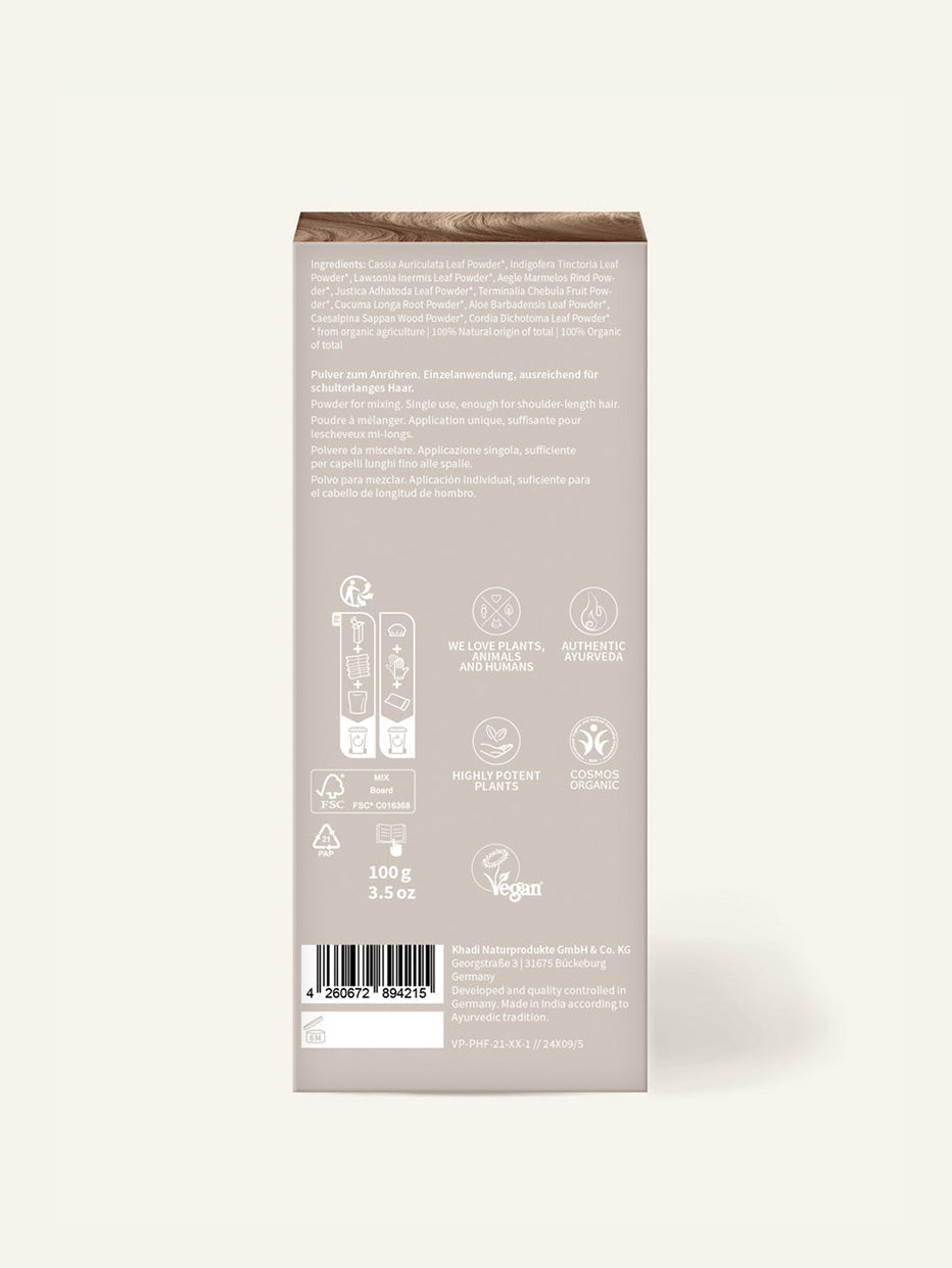 W przeciwieństwie do syntetycznych farb do włosów, w których środki utleniające powodują pęcznienie włosów, aby otworzyć zewnętrzną warstwę łuski dla pigmentów, w naturalnych farbach do włosów khadi pigmenty otaczają warstwę łuski każdego pojedynczego włosa niczym ochronna powłoka. Dzięki ajurwedyjskim właściwościom pielęgnacyjnym naszych składników włosy i skóra głowy nie są niszczone podczas koloryzacji, ale odżywiane i rozpieszczane. Rezultat: zdrowa uroda, którą można poczuć i zobaczyć.