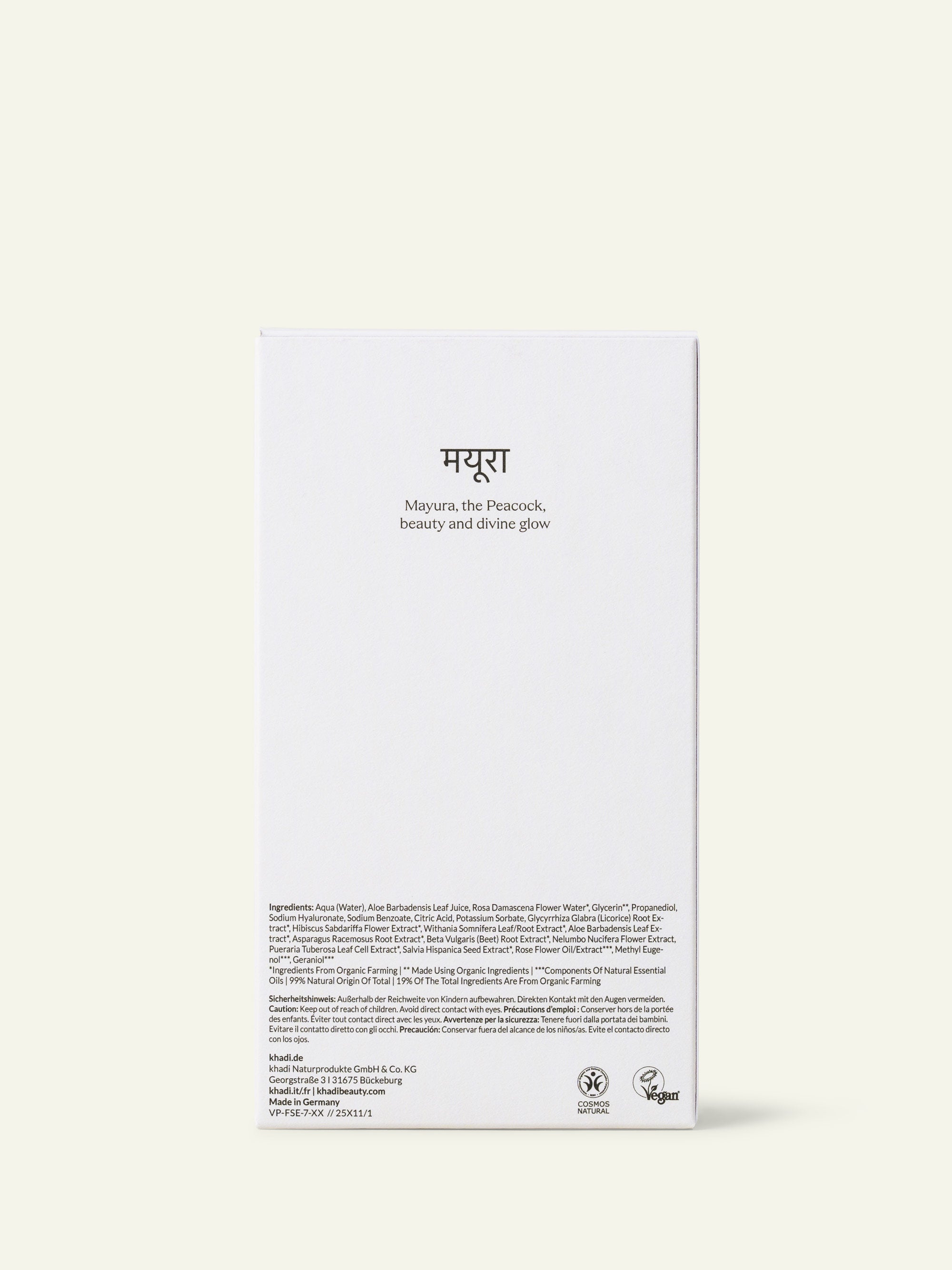 100% naturalne – certyfikowane – wegańskie: podobnie jak wszystkie produkty khadi, serum Mayura Glow nie zawiera syntetycznych dodatków i jest produkowane z miłością do natury w Niemczech.