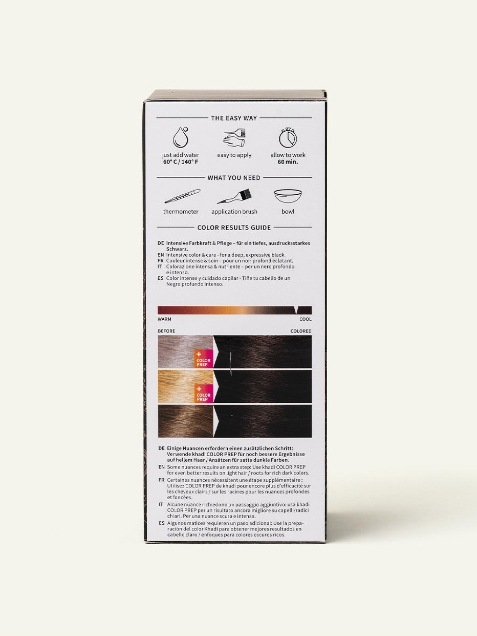 khadi Czarny doskonale nadaje się do trwałego farbowania włosów i w naturalny sposób ożywia je, nadając im zdrową witalność. Indywidualny efekt zależy od naturalnego koloru włosów.
