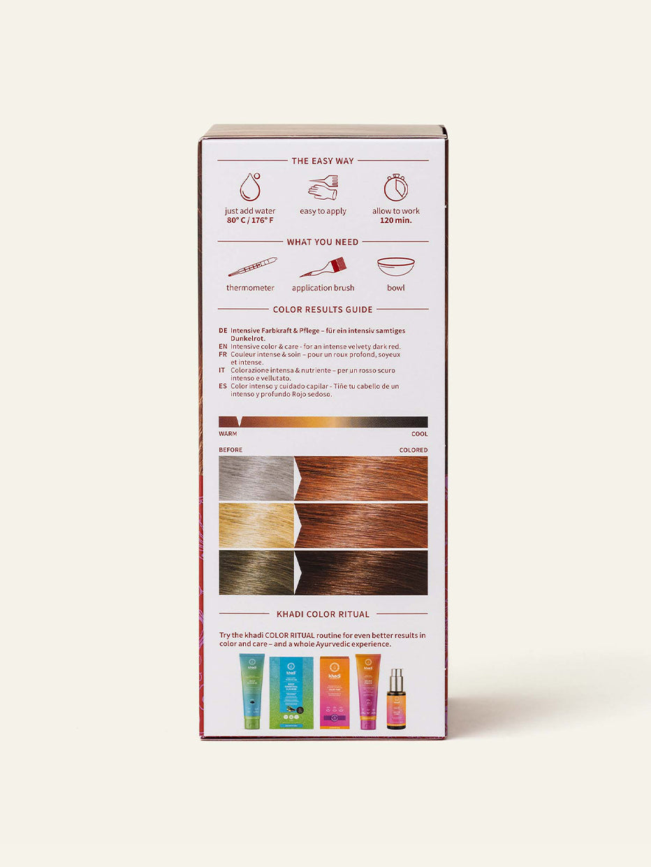 W przeciwieństwie do syntetycznych farb do włosów, w których środki utleniające powodują pęcznienie włosów, aby otworzyć zewnętrzną warstwę łuski dla pigmentów, w naturalnych farbach do włosów khadi pigmenty otaczają każdy włos niczym ochronna powłoka. Dzięki ajurwedyjskim właściwościom pielęgnacyjnym naszych składników włosy i skóra głowy są zdrowe, odżywione i wzmocnione.