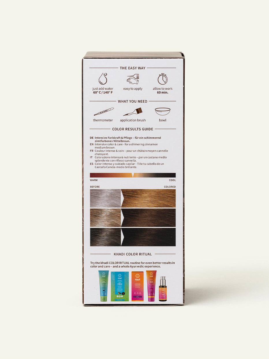 Średni brąz khadi doskonale nadaje się do trwałego farbowania włosów i pozwala im w naturalny sposób odzyskać zdrową witalność. Ostateczny efekt zależy od naturalnego koloru włosów.
