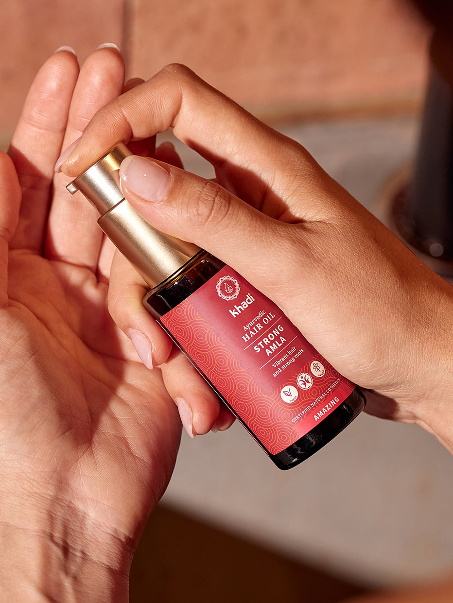 Wyjątkowa tajemnica działania Strong Amla opiera się na Ajurwedyjskim khadi Amla Elixir, wysoko skoncentrowanym ekstrakcie z ręcznie zbieranych ajurwedyjskich roślin leczniczych. Eliksir khadi oparty jest na tradycyjnej ajurwedyjskiej kombinacji składników aktywnych z ziół, kory i owoców. Są one gotowane i mieszane przez nas w ramach pełnego oddania ajurwedyjskiego rytuału produkcyjnego, aż magiczne właściwości lecznicze natury zostaną w nich wzmocnione. Zawartość eliksiru khadi w olejku do włosów khadi wynosi do 20%, podczas gdy w tradycyjnych olejkach do włosów wynosi ona tylko 2-5%.