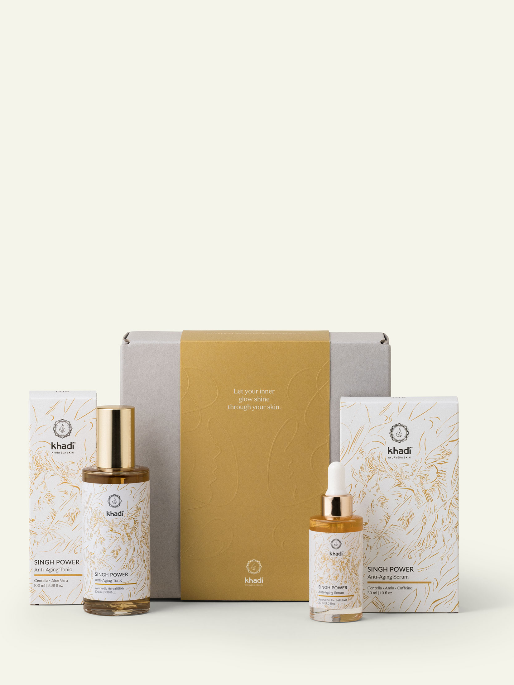 Zainspirowany ajurwedą zestaw aktywuje naturalną witalność skóry – wzmacnia ją, ujędrnia i nadaje jej wyczuwalną sprężystość. Ajurwedyjski eliksir ziołowy Singh Power działa intensywnie, odmładzając skórę od wewnątrz i nadając jej nowy blask. Wysoce skuteczny kompleks kofeiny zapewnia wyczuwalny efekt liftingu.