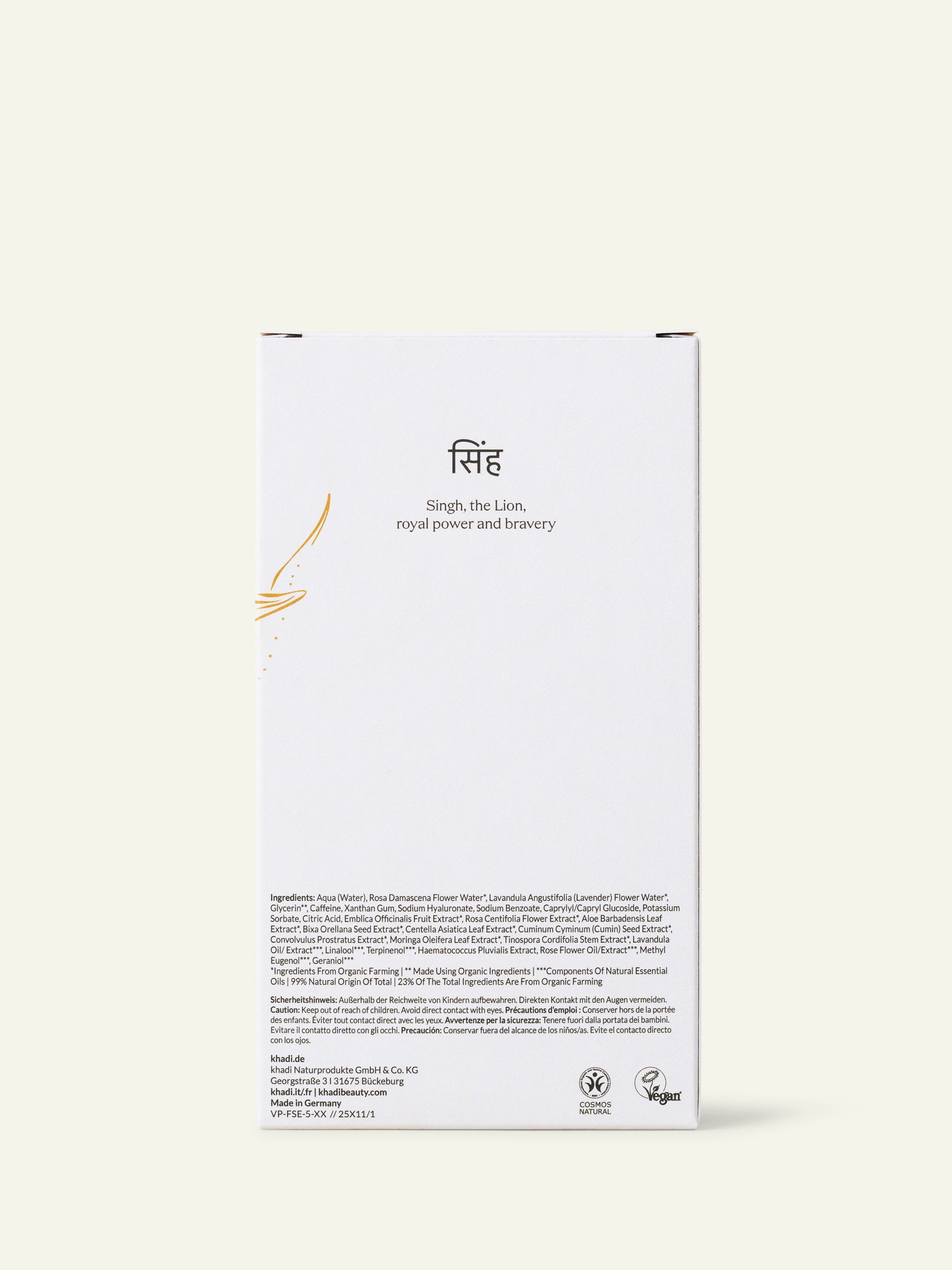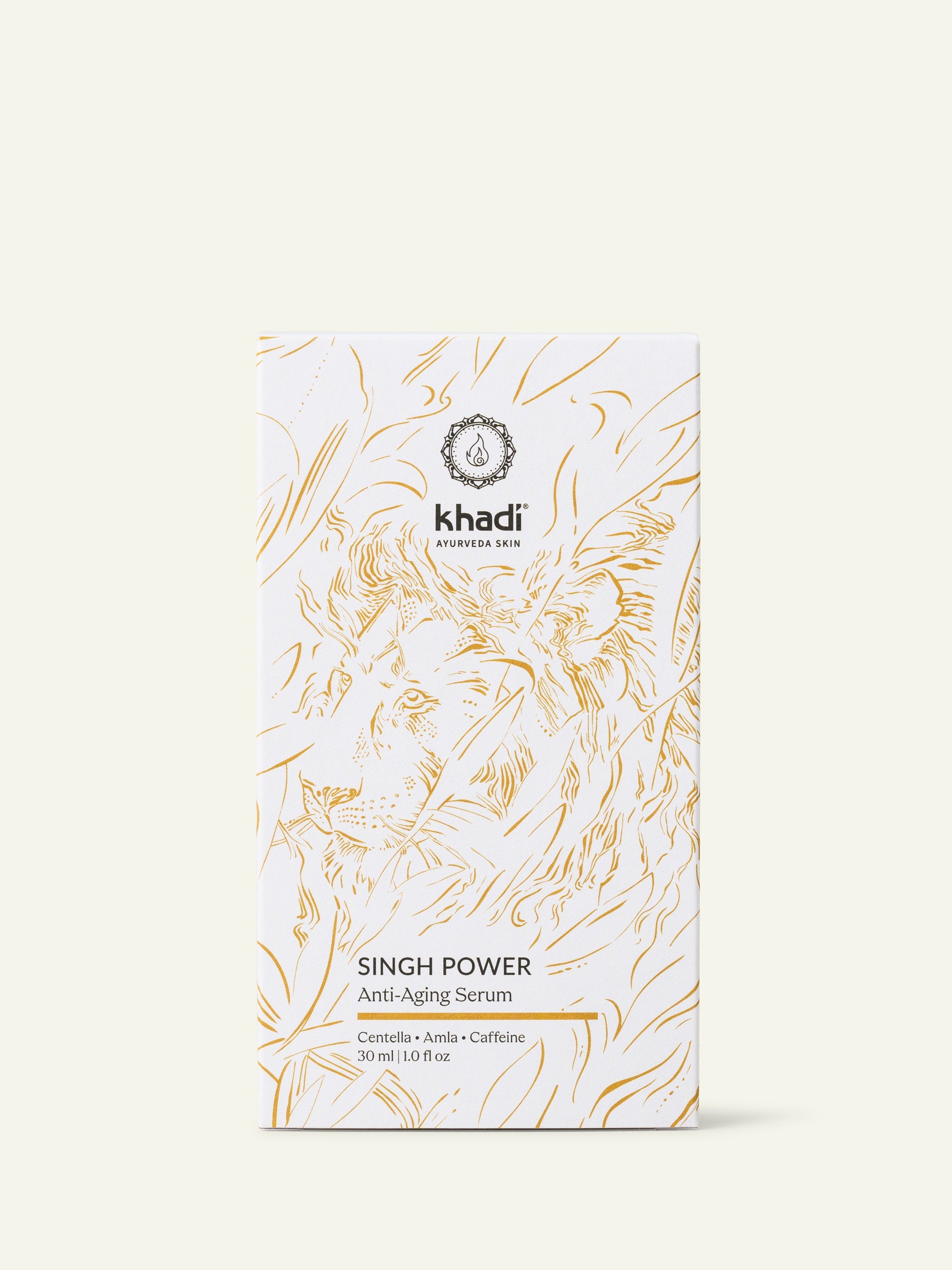 Sercem produktu jest eliksir khadi Singh Power, wytwarzany tradycyjną metodą. Łączy on w sobie silne ekstrakty roślinne z amli, centelli, nasion chia, ashwagandhy i korzenia bala, tworząc odżywczy kompleks, który intensywnie pielęgnuje, chroni i regeneruje. Aloes zapewnia głębokie nawilżenie, a róża centifolia z naturalną witaminą C stymuluje odnowę komórkową. Zawarty w nim silnie działający kompleks kofeiny bezpośrednio stymuluje mikrokrążenie skóry i zapewnia zauważalny efekt liftingu. Eliksir ziołowy khadi z centelli, amli i moringi ma długotrwałe działanie wygładzające, wspomaga produkcję kolagenu i zapewnia jędrną, odmłodzoną cerę.