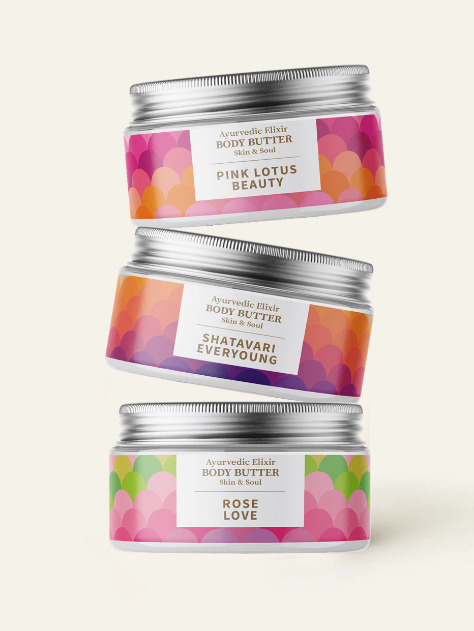 Wyjątkowa tajemnica działania Shatavari, Pink Lotus i Rose Love opiera się na ajurwedyjskim khadi Elixier, wysoko skoncentrowanym ekstrakcie z ręcznie zbieranych ajurwedyjskich roślin leczniczych. Każdy eliksir khadi oparty jest na tradycyjnej ajurwedyjskiej kombinacji składników aktywnych z ziół, kory i owoców. Są one delikatnie gotowane i mieszane zgodnie z ajurwedyjską zasadą produkcji, aż wzmocnią się magiczne właściwości lecznicze natury – w ajurwedzie ten „magiczny napój” nazywany jest wywarem leczniczym. Zawartość każdego eliksiru w maśle do ciała wynosi do 20% w porównaniu z zaledwie 2-5% zawartością składników aktywnych w tradycyjnych naturalnych kosmetykach do ciała.
