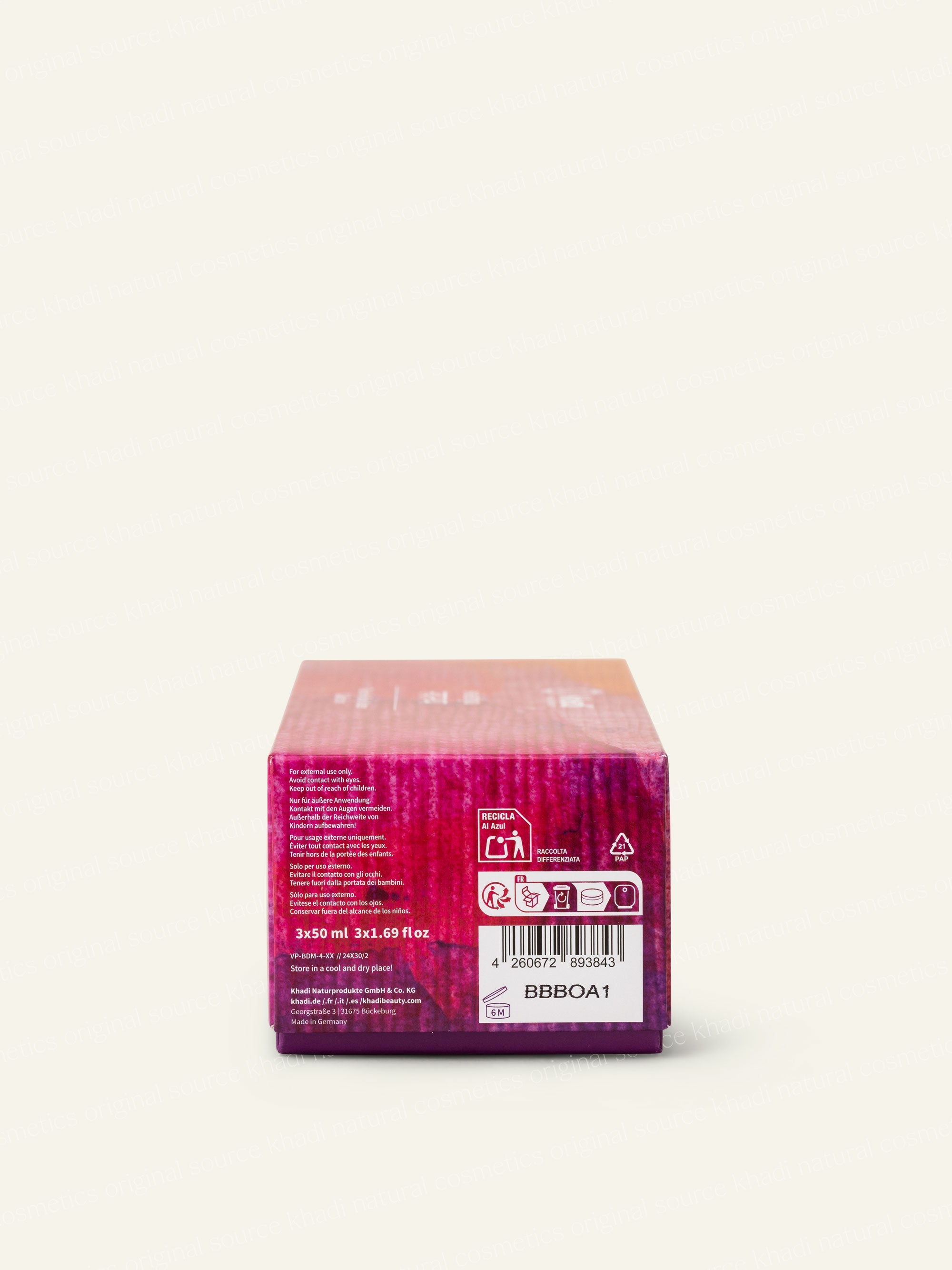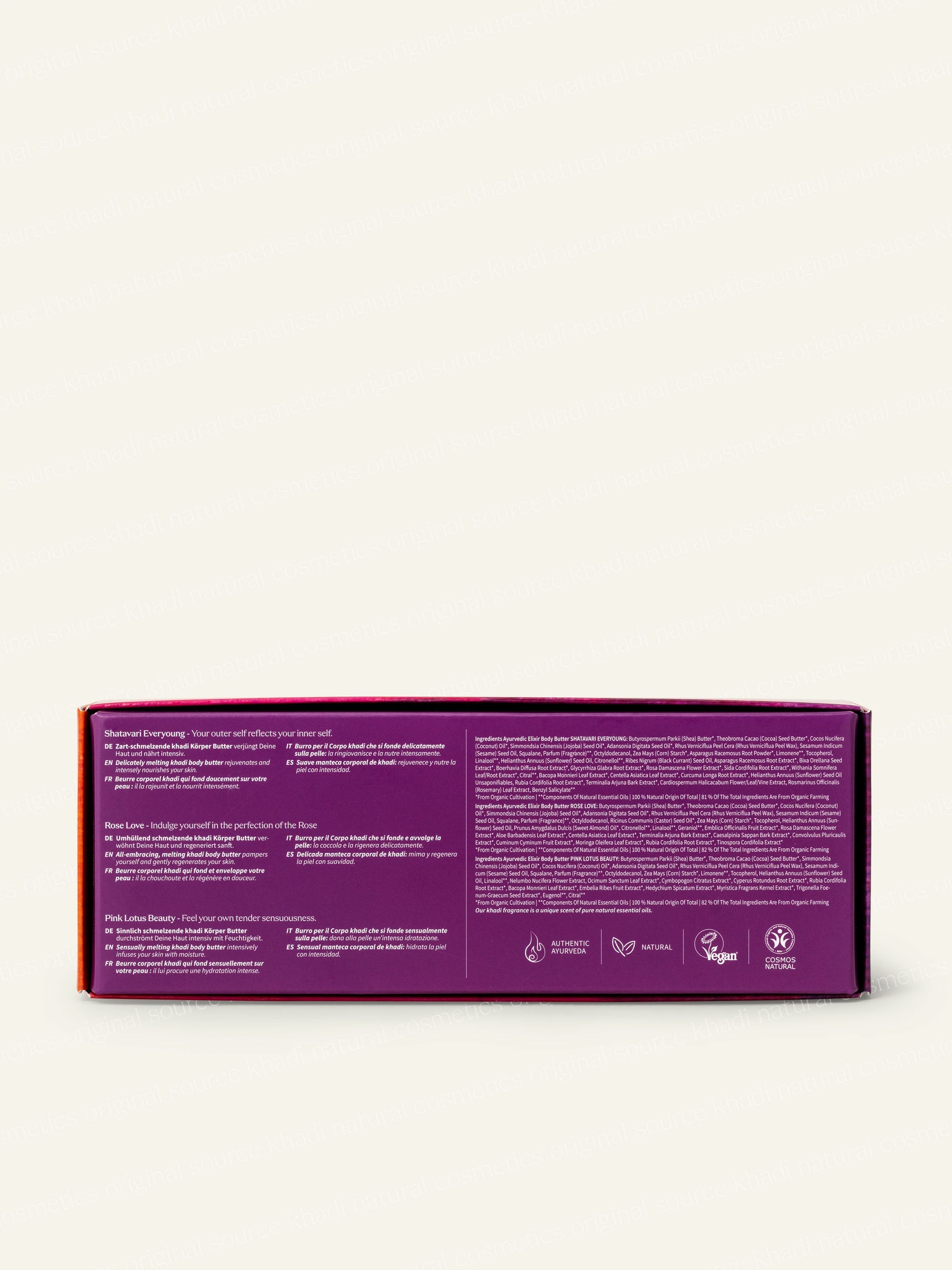Ciesz się luksusem różnorodności i trzymaj się trzech różnych zapachów i efektów dla Twojej skóry i zmysłów. Khadi Holy Body Butter svásthya Collection, składająca się z Shatavari Everyoung, Rose Love i Pink Lotus Beauty, oferuje Ci program pielęgnacyjny, który możesz dostosować do swojego samopoczucia i potrzeb skóry. Słowo svásthya pochodzi z sanskrytu i oznacza dobre samopoczucie – i właśnie to głębokie uczucie miłości i bezpieczeństwa chcemy podarować Tobie i Twojej skórze dzięki naszemu trio masła do ciała.