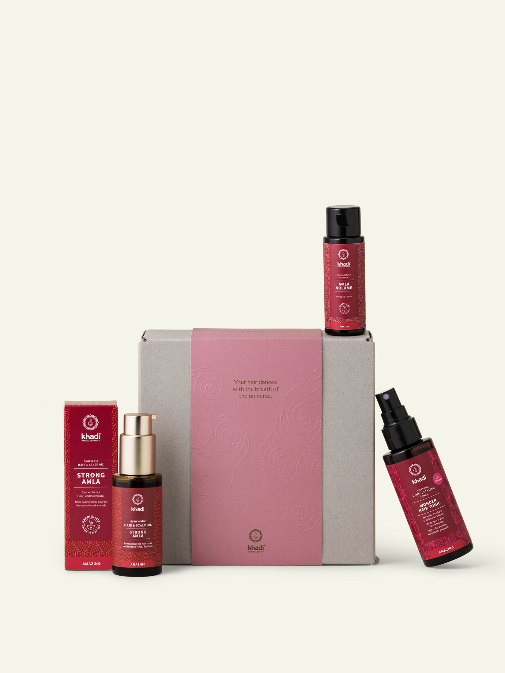 Ten zestaw do pielęgnacji włosów z bestsellerowej linii Amla jest przeznaczony dla osób, które kochają mocną objętość. Starannie zapakowany prezent, z uroczą ilustracją autorstwa artystki Nikity Fabbro, która oddaje radość życia i witalność. W tradycji ajurwedyjskiej silnie działająca pielęgnacja Amla odpowiada na potrzebę wzmocnienia: wzmacnia cebulki, ożywia włosy, dodaje im energii – ręcznie zbierana, czysta, wykonana z miłością.